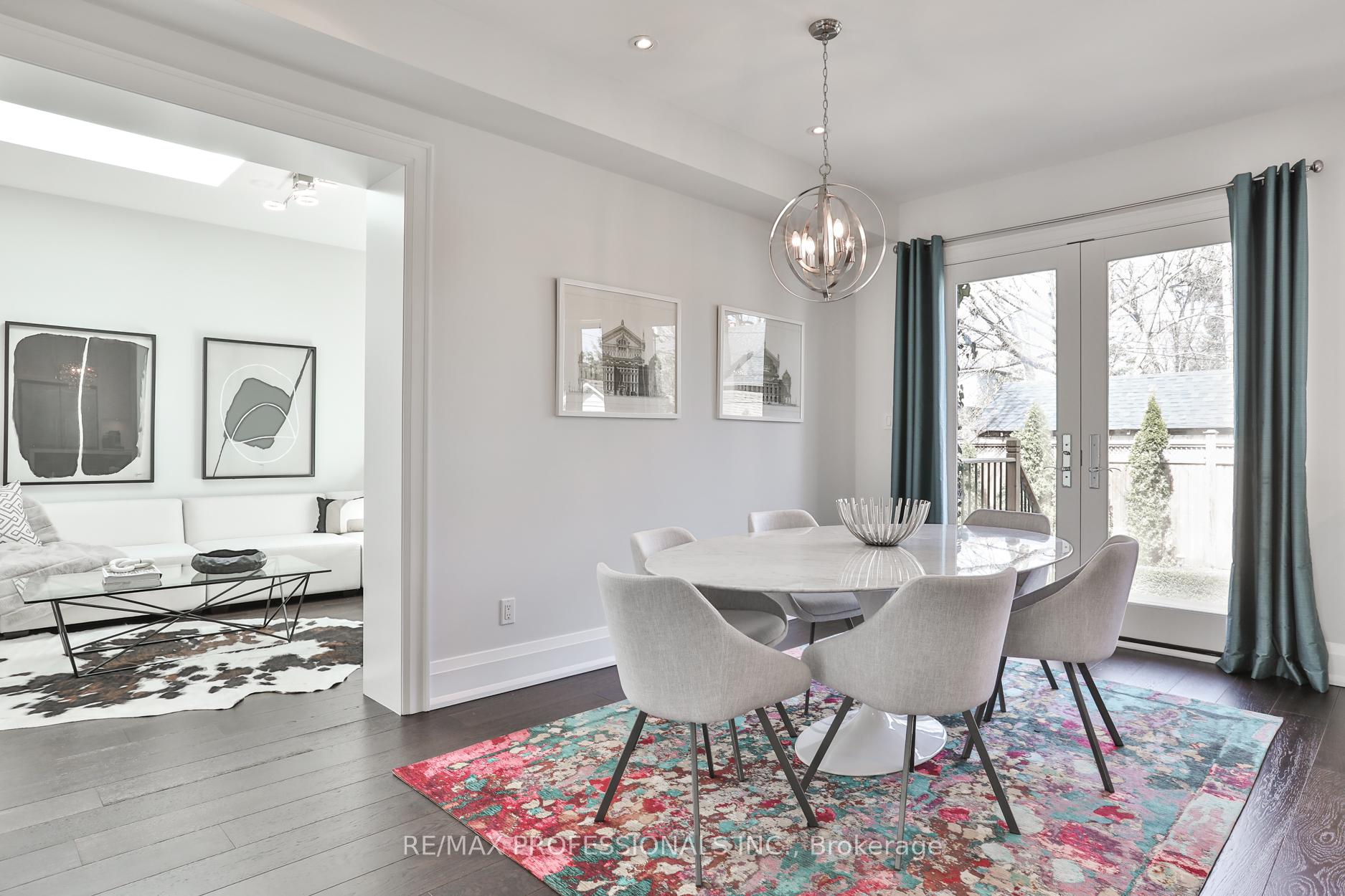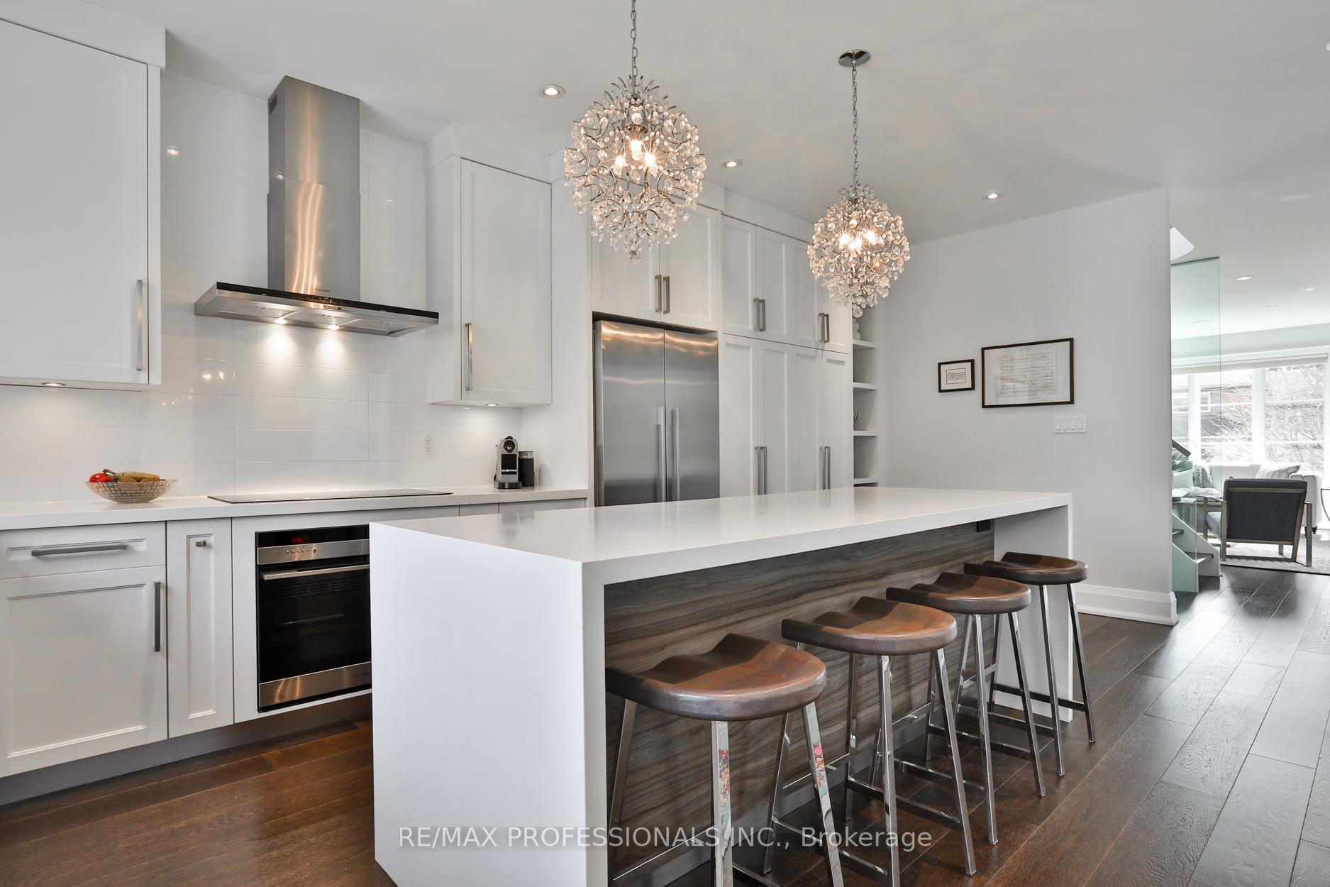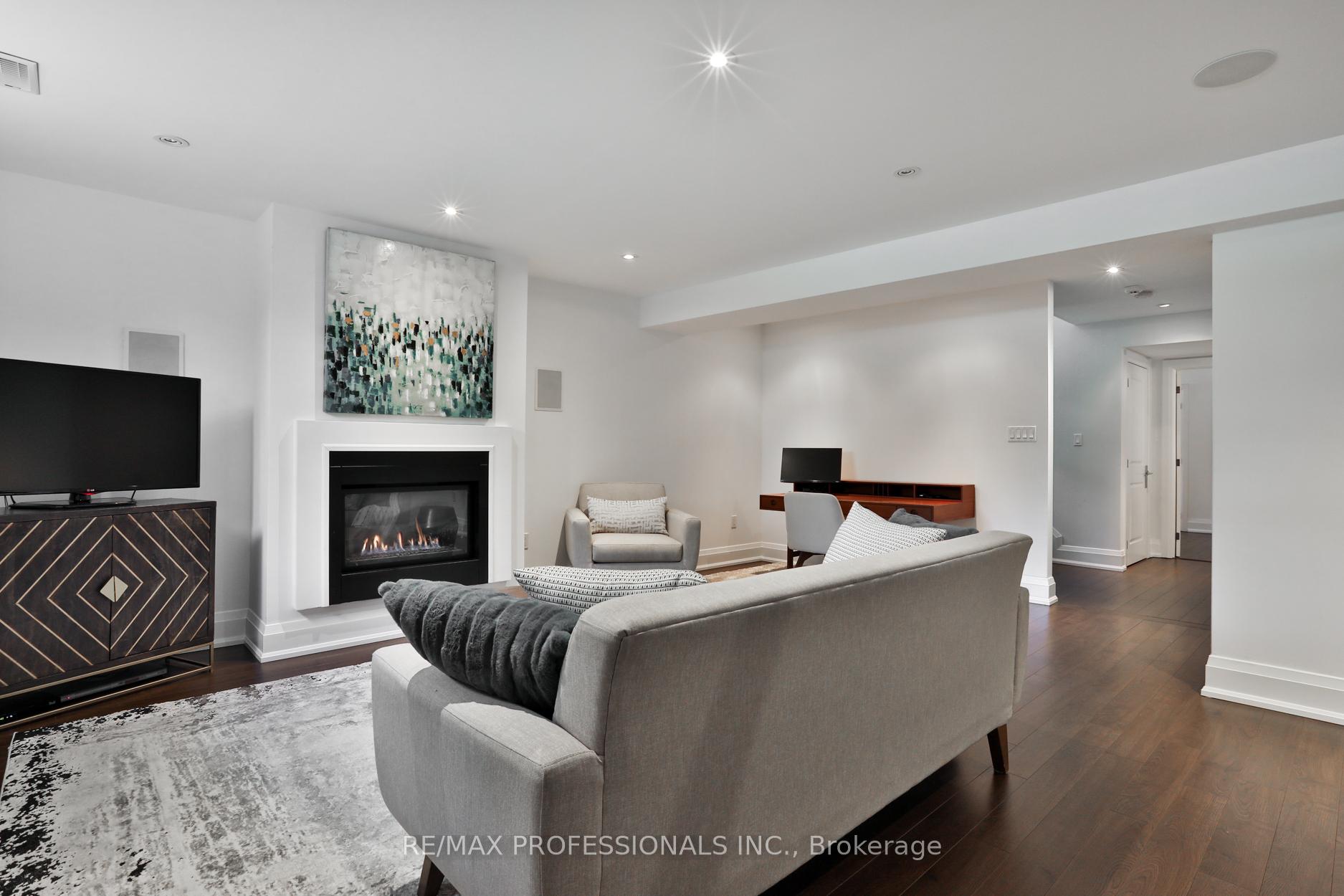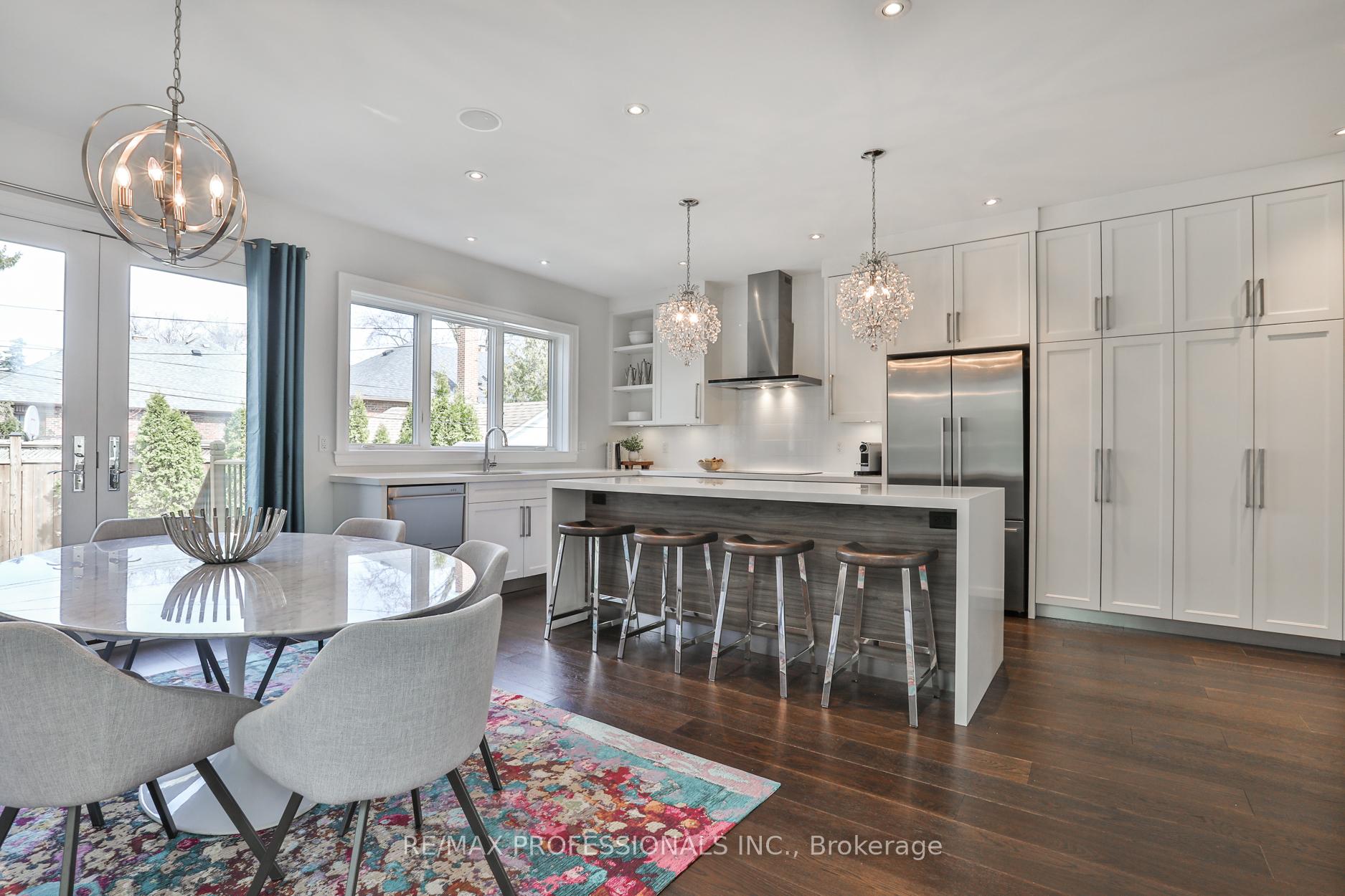 Nestled in the heart of Thompson Orchard Park, this sophisticated and stylish residence offers a seamless blend of contemporary design and timeless elegance. Step inside to a bright and welcoming foyer that sets the tone for the thoughtfully designed interior. The formal living room features a sleek gas fireplace, creating an inviting space for relaxing or entertaining. At the heart of the home, a chef's kitchen impresses with top-end integrated stainless steel appliances, a waterfall-edge centre island with breakfast bar, and an open flow to the dining area. French doors walk out to a private, landscaped yard complete with a deck and stone patio - perfect for outdoor gatherings. Adjacent to the kitchen, a sky-lit family room adds warmth and natural light, offering a comfortable everyday living space. Upstairs, the second level is anchored by a luxurious primary suite featuring dual double closets, a custom walk-in closet with organizers, and a sky-lit 5-piece ensuite bath. Two additional bedrooms and a beautifully finished 4-piece bath complete this level. The fully finished basement extends the living space with a cozy rec room and gas fireplace, a fourth bedroom, a stylish 3-piece bath, and a well-appointed laundry room. Ideally located just 5 minutes to the subway, Kingsway shops, cafes, and fine dining. Walk to top-rated schools and scenic parks, with an easy commute to downtown and the airports.