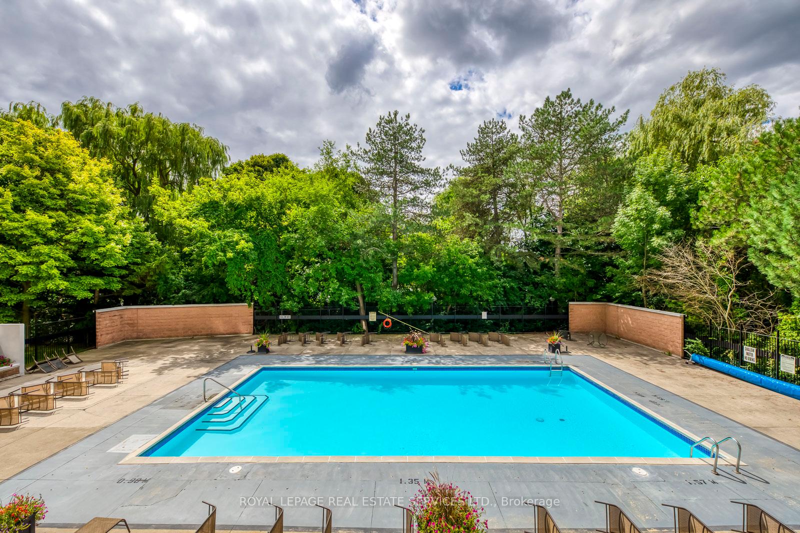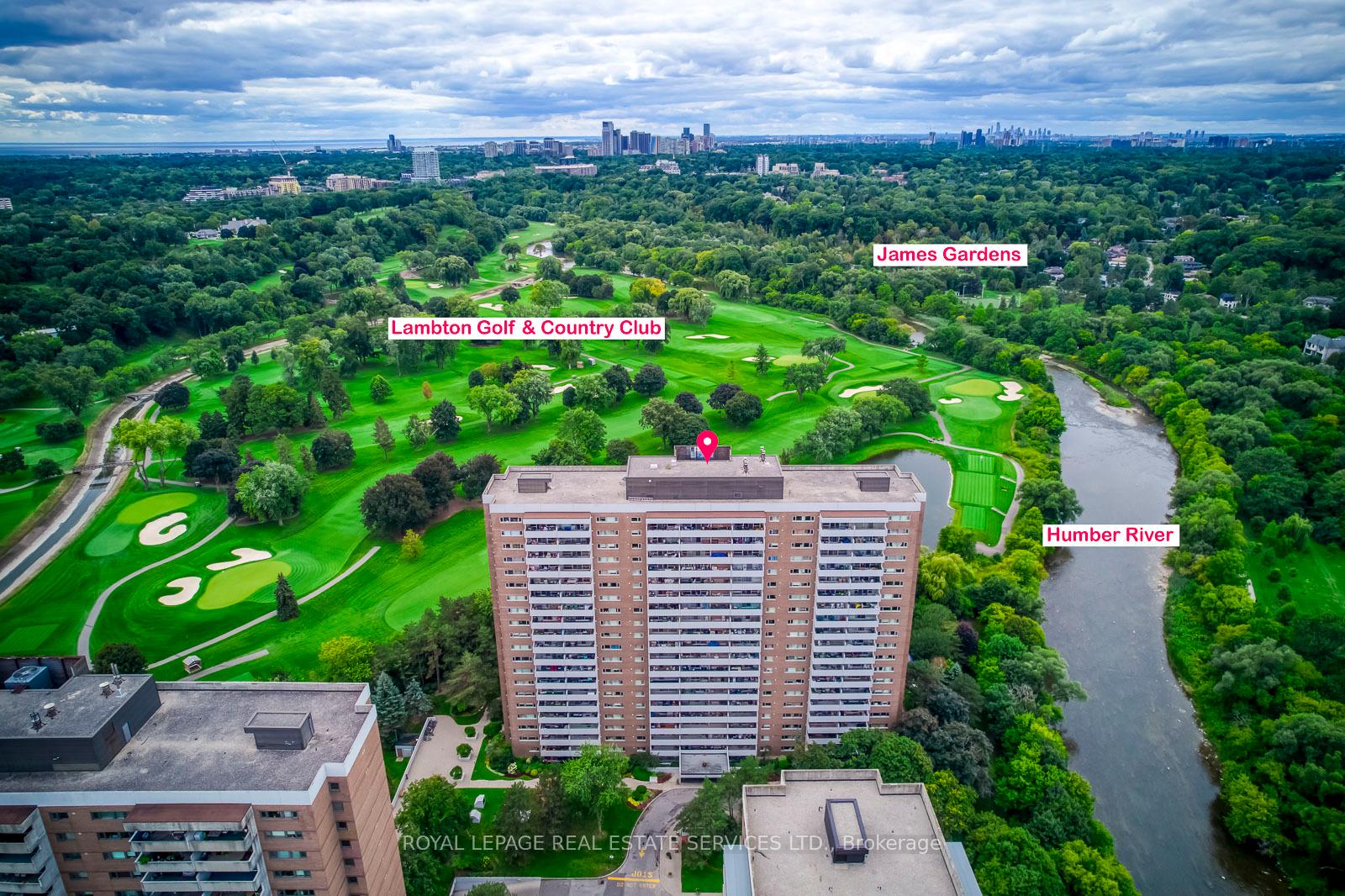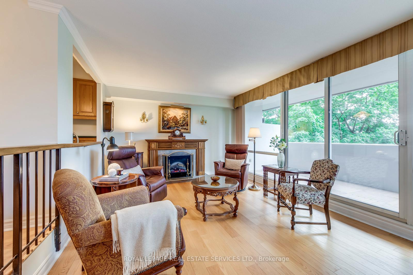 The Lambton Square condominium community consists of four distinct towers, each forming a separate condo corporation with its own dedicated recreation facilities. This condo is ideally situated at 240 Scarlett Rd and offers exceptional access to a wide range of amenities. Public transit is steps away, with multiple bus routes along Scarlett and easy connections to Runnymede Station on the Bloor subway line. Daily conveniences are nearby: grocery stores, European bakeries, and local shops. For nature lovers, the building backs onto the Humber River trails and is a short stroll to James Gardens-perfect for walking, cycling, or simply enjoying the outdoors. Golf enthusiasts will appreciate having the prestigious Lambton Golf & Country Club next door. Unit 405 offers exceptional value for those seeking spacious & functional living. The unit offers a family-sized kitchen with a cozy breakfast nook, a proper dining room, and a generous sunken living room with an electric fireplace. When you step out onto the oversized private balcony, the first thing you notice is the Humber River flowing just right there. Surrounded by mature trees, it feels less like a condo and more like your own private home. Beautiful flooring runs through the main areas, with wood parquet in the bedrooms. The primary bedroom includes a large closet and a 4-piece ensuite. The second bedroom works beautifully as a guest room or home office. Both bathrooms are 4-piece, featuring built-in cabinetry, a shower enclosure, and a soaker tub. An ensuite laundry room with additional storage completes this well-designed space. The building offers top-tier amenities: outdoor pool, fitness centre, sauna, party/meeting rooms, car wash bay & bike storage. Condo fees include **ALL utilities, **ROGERS high-speed internet and full cable TV package (Crave, HBO, full sports, etc.). Enjoy exclusive use of one parking spot and one locker, both included in the purchase price.