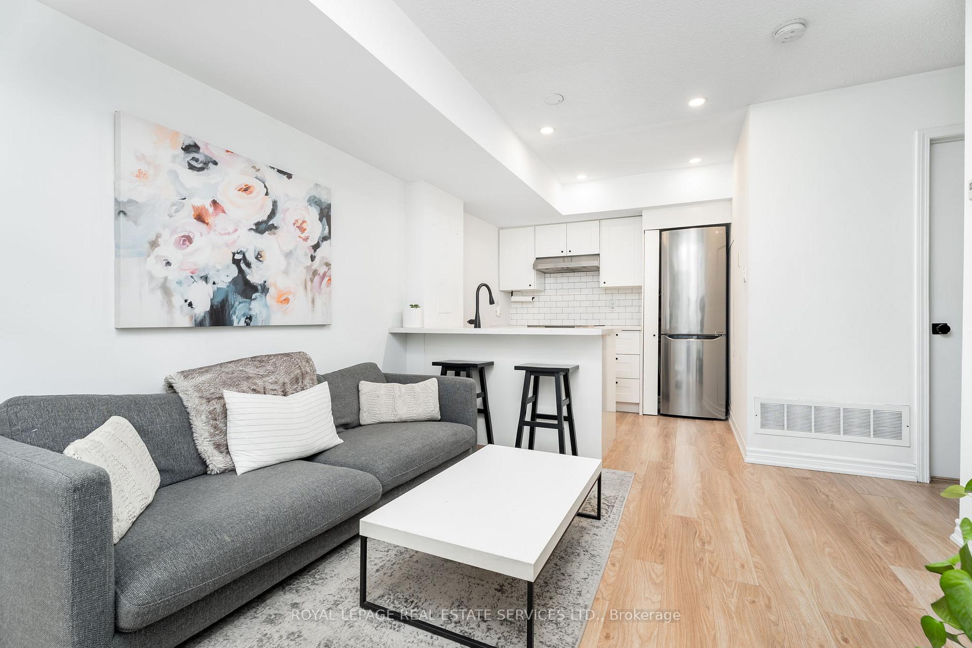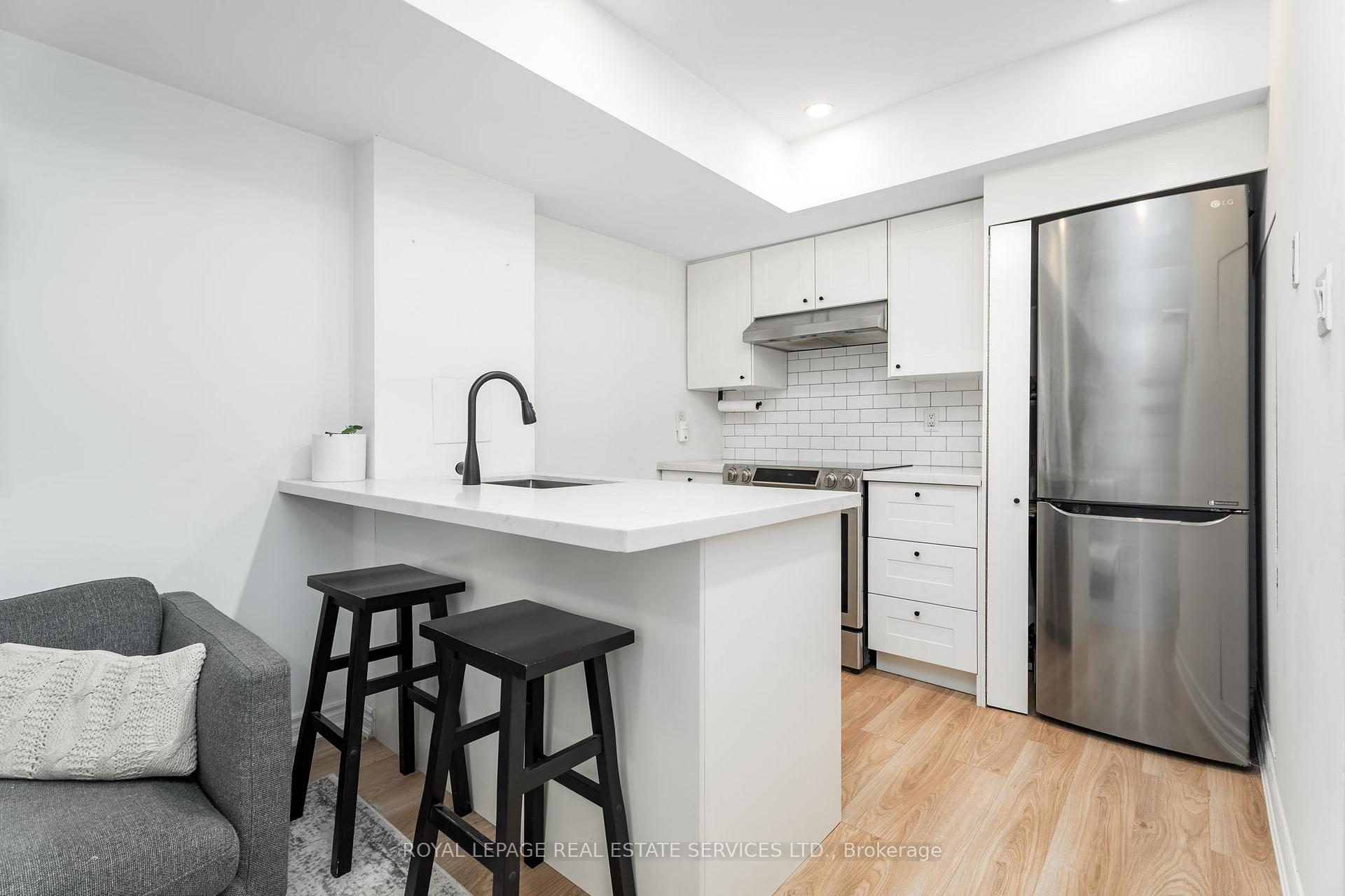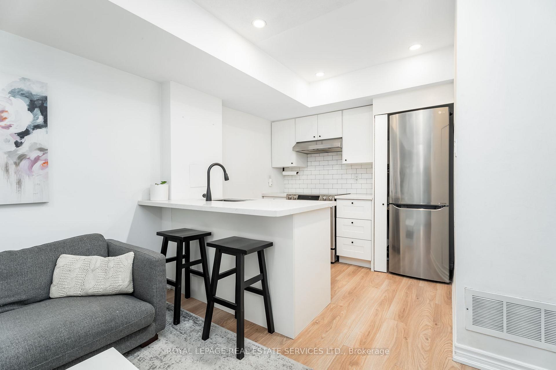 Rarely Offered Portland Park Village Townhome with Parking Included! Enjoy the best of downtown living in this beautifully updated 1-bedroom, 1-bathroom suite with a private terrace, perfect for entertaining or relaxing outdoors. The kitchen and bathroom were renovated in 2020, showcasing modern style and quality finishes. The chef's kitchen features quartz countertops, a convenient breakfast bar, and stainless steel appliances, while the open-concept layout offers seamless flow between the living and dining areas. Additional highlights include laminate flooring, ensuite laundry, and a spacious bedroom. With your own private entrance and access to a lovely garden space and private terrace this home offers the ideal balance of comfort and city living. Perfectly located across from the park and steps to King and Queen West's vibrant shops, The Well, restaurants, bars, TTC, and the Financial District. Move in and enjoy all that this sought-after neighbourhood has to offer! Access to a large top notch fitness facility included, perfect for the CrossFit lover, no need to join a gym. The furniture can be included or removed for the tenant!